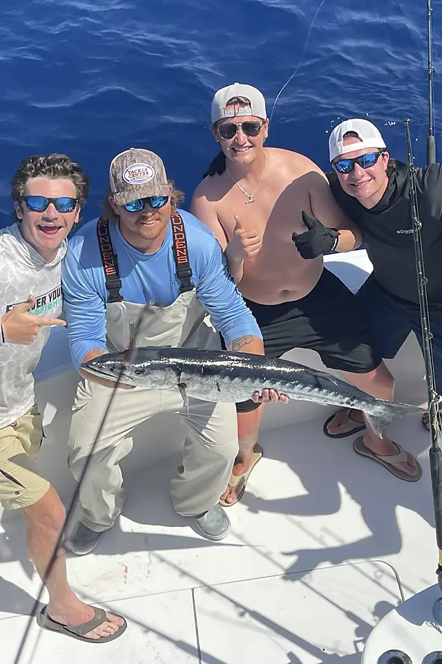 Wahoo are the speed demons of our waters, hitting 50+ mph and known for their blistering runs that'll test your drag. These sleek predators average 3-5 feet and 20-40 pounds, with that distinctive blue-striped silver body and razor-sharp teeth. They cruise the blue water from 50-200 feet deep, often near drop-offs and current edges. Summer through fall brings the best wahoo fishing, especially July to November when they're most abundant. What guests love about wahoo is that explosive initial run and the premium table fare - white, flaky meat that's perfect for fish tacos or grilling. Here's the key: troll fast at 12-15 knots with wire leaders, because those teeth will slice through anything else like butter.